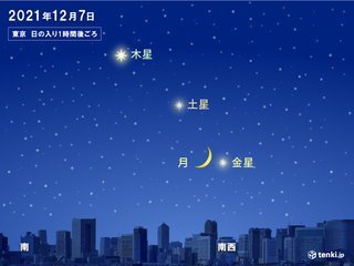 2021/12/7日(火)は、南西の空に細い月と金星が接近して見えます。土星と木星も並んで近くに見えますので、防寒対策をして、月と惑星のコラボを楽しんでみるのはどうですか?