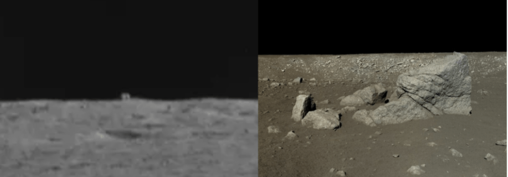 『そうですね、それは、オベリスクやエイリアンによるものでは、ありませんが確かにチェックするべきですね。画像から多くのことを判別するのは、厳しいですが8年前の12/1に開始された嫦娥3号のミッションにも見られるように大きな岩(右)は、衝突によって発掘されることがあります。』となっている。(Googleより)